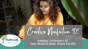 February 12: Creative Nonfiction 101: https://www.meetup.com/memoir-mentors/events/290915191/